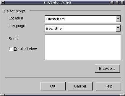 Edit/Debug Scripts - This pops up a dialog in which the user can experiment with writing and executing JavaScript & BeanShell code. As with the Assign dialogs, the [Browse] button allows the user to select scripts located on the filesystem. (and is only enabled under the same conditions as in the Assign dialogs). See Writing Scripts in BeanShell and Java for more information on using this window.
